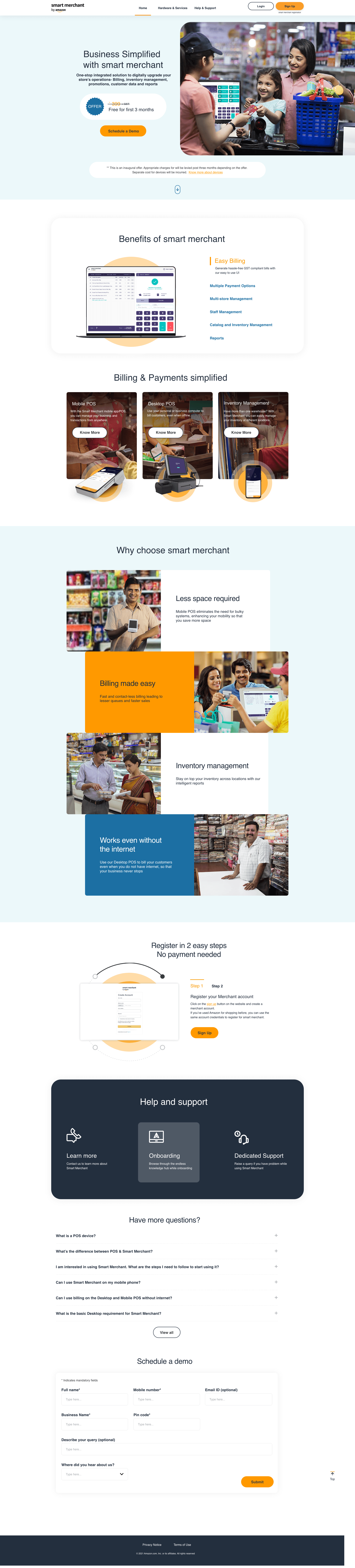 Designed the complete UX/UI for Amazon's POS machine micro website — a product-focused site that guides users through how the POS machine works, how to get one, usage guidelines, terms & conditions, and support resources. As the sole designer on the project, I owned the entire design process from wireframing to final visuals, delivering a fully responsive experience across desktop and mobile breakpoints.
